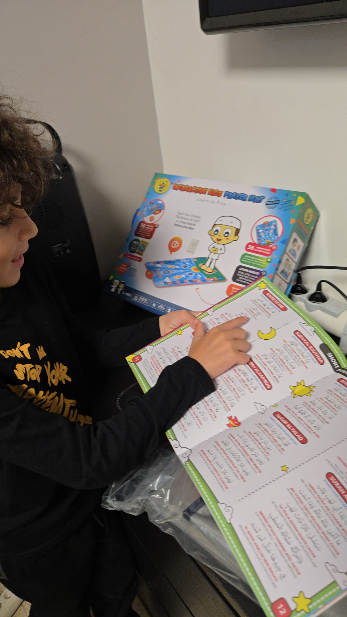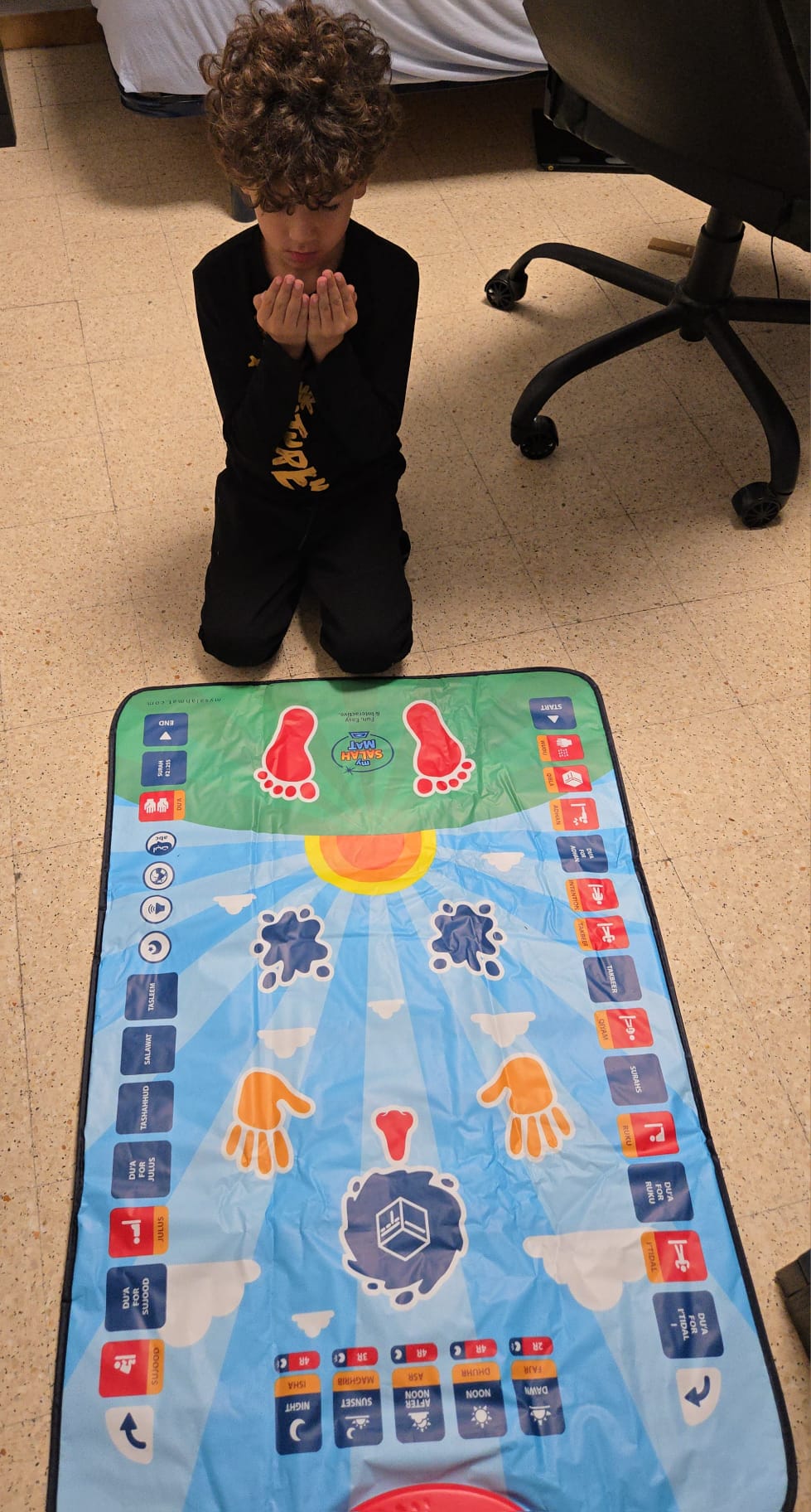 De cette réflexion est né le Tapis de Prière Interactif.Un tapis pensé pour accompagner les enfants dans la découverte de la prière, de manière ludique, bienveillante et inspirante.Chaque bouton, chaque son, chaque lumière a été imaginé pour transformer la prière en un moment de joie et de douceur.